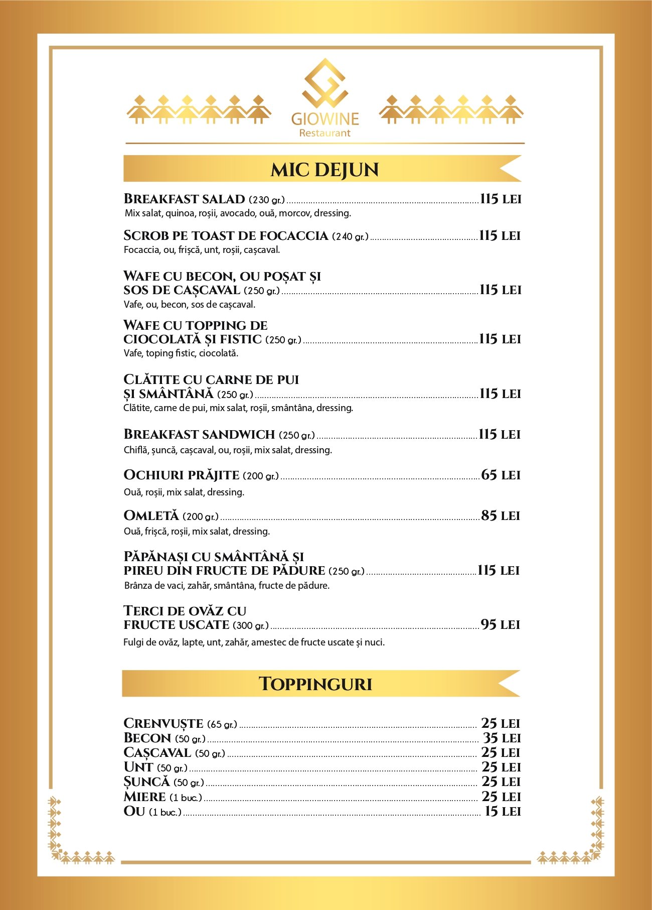 Restaurantul Giowine oferă regulat preparate delicioase tradiționale, cât și bucate ca pizza, burghere și alte opțiuni vegetariene și sănătoase de mâncare. Micul dejun este bogat și variat – prăjituri proaspete, clătite, brânzeturi locale și multe altele! Mai mult ca atât, oferim și servicii de livrare a produselor noastre la comandă.